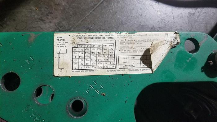Greenlee 880 Tube Bender w/Dies Die Capacities: 1/2'' to 2'' 110 Volt Greenlee High-Pressure Hydraulic Pump Model #: 975 Rigid Pipe Vice Model #: 23 Mounted on 4-wheel steel table